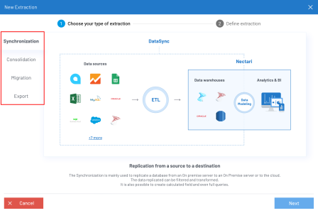 According to your need, 4 extraction types are available to interact with the data sources: