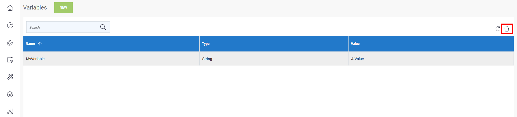 - Simply select a variable from the variable list then click on the trashcan icon in upper right-hand corner of the DataSync interface (shown below).