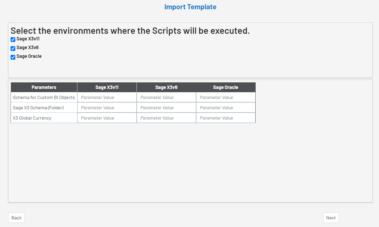 5. Mappez les dictionnaires en sélectionnant les Environnements à importer, et pour chaque Environnement sélectionné, spécifiez le Schéma contenant les informations du dictionnaire (le schéma Sage X3).