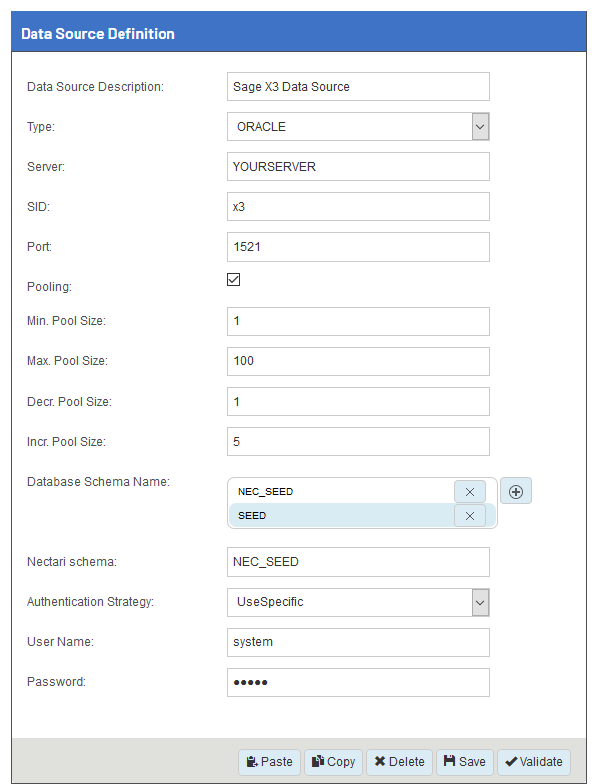 Pour les utilisateurs d'Oracle, à partir de 2021 R1.1 et de la version 119 de Sage X3, le modèle Sage X3 ne créera plus automatiquement un Utilisateur et Tablespace Oracle pour l'utilisation de Nectari. Ceci afin de donner aux utilisateurs de Nectari la liberté de configurer un Utilisateur et Tablespace Oracle selon leurs propres préférences et d'éviter de se connecter aux bases de données en tant que leur utilisateur système.