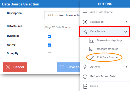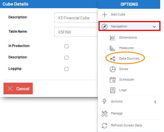 3. Dans la liste, sélectionnez X3 Financial Cube,cliquez sur Navigation et sélectionnez Sources de Données.