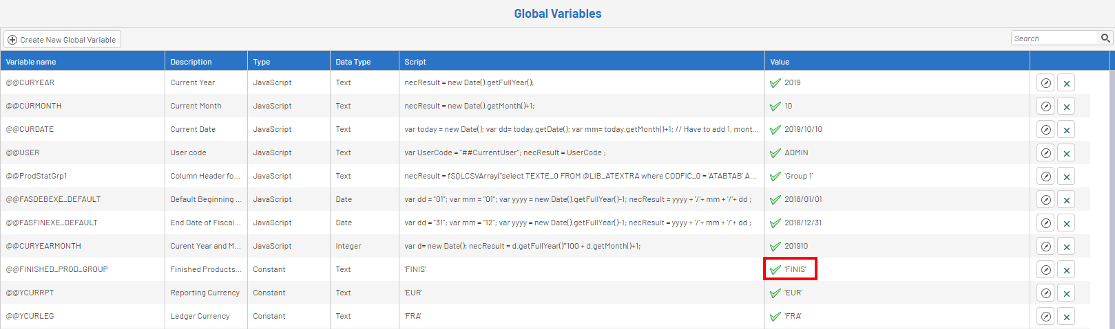 Configuration de la variable globale Produits finis