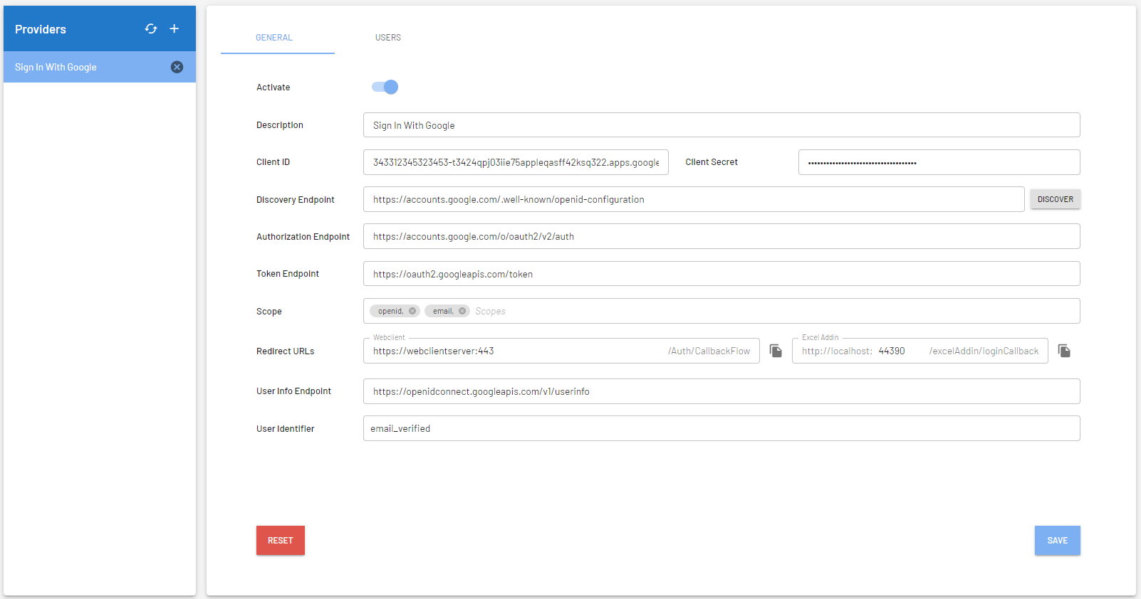 The following screen shot is an example of where to set the values that were retrieved from the Google provider.