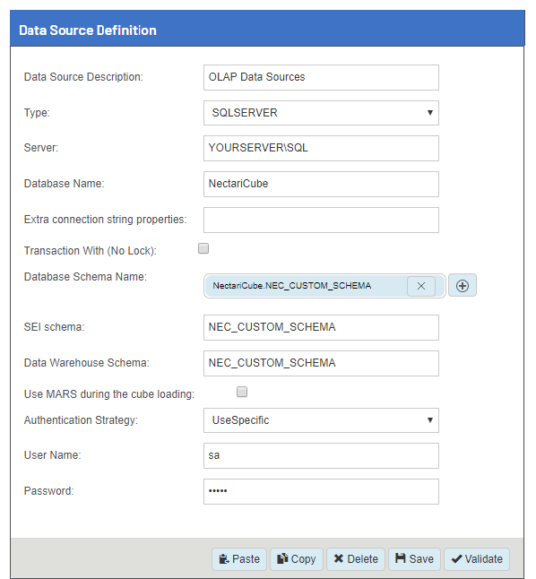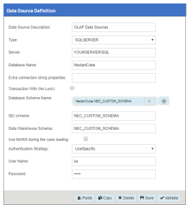 - Serveur de base de données sur lequel est installé le paquet d'installation Nectari OLAP For SQL Server.