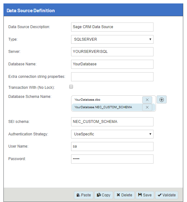 - Terminer la configuration de la source de données ERP. Voir les instructions pour MS SQL Server ci-dessous.