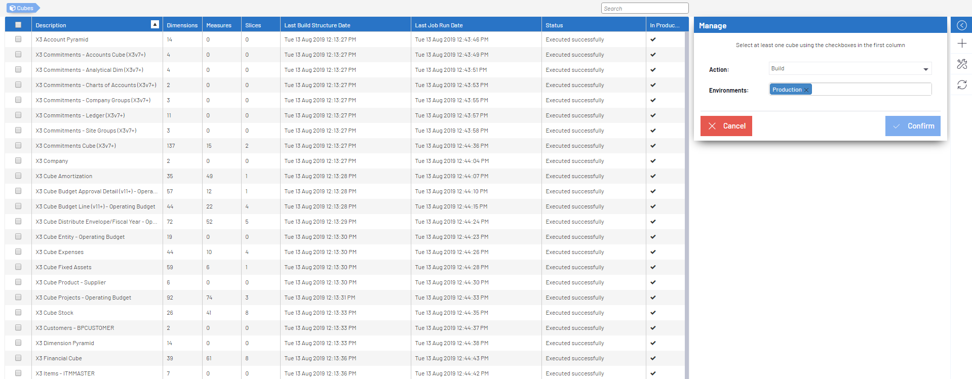 - Dans la section de gauche, sélectionnez tous les cubes à construire en cochant la case à côté de la colonne Description.