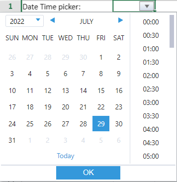 DateTime Picker: The date time picker drop-down allows you to set date and time to populate the evaluated result in the cell.
