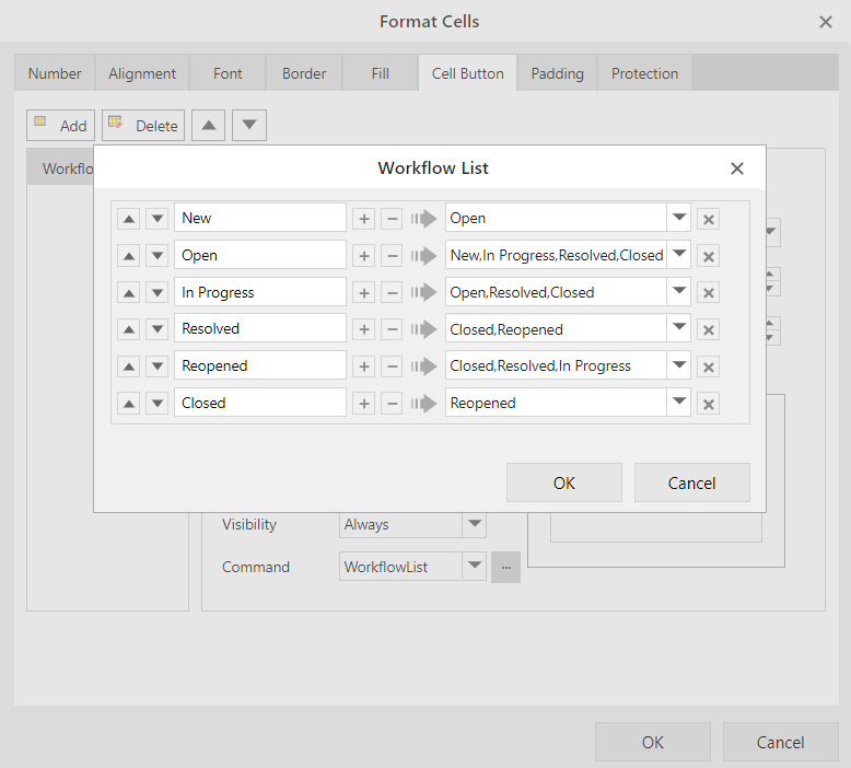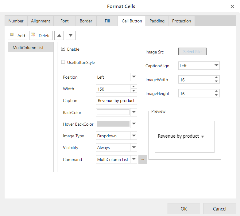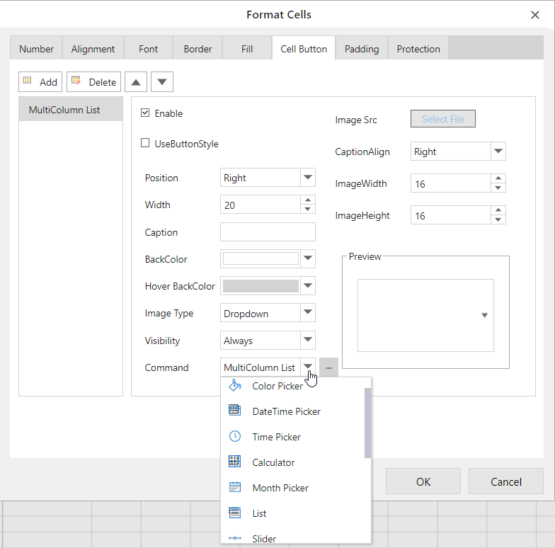 Displays the button selected in the Command drop-down list. It reflects the value of the item you selected in the Cell Dropdowns menu. Click Add to add more buttons and select the command you wish to assign to each button. |