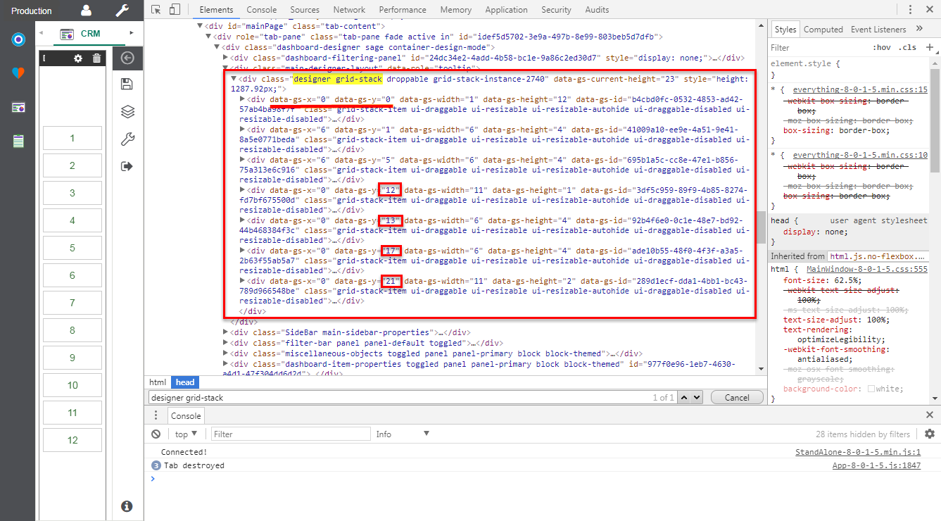 Toutes les tuiles du tableau de bord se trouvent à l'intérieur de la balise div identifiée. Pour chaque balise, recherchez les attributs suivants : data-gs-x et data-gs-y. Ensuite, identifiez toutes les valeurs supérieures à 11.