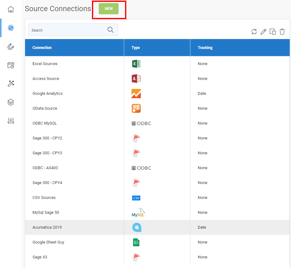 - In the upper left corner, click on New to create a new Source connection.