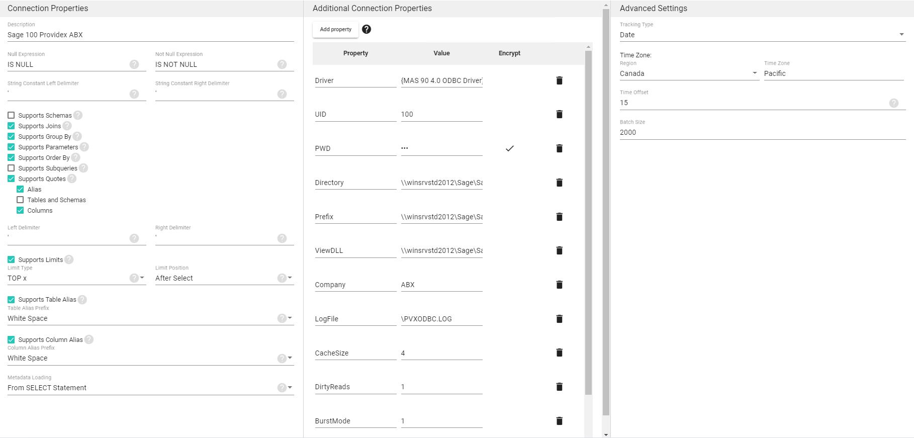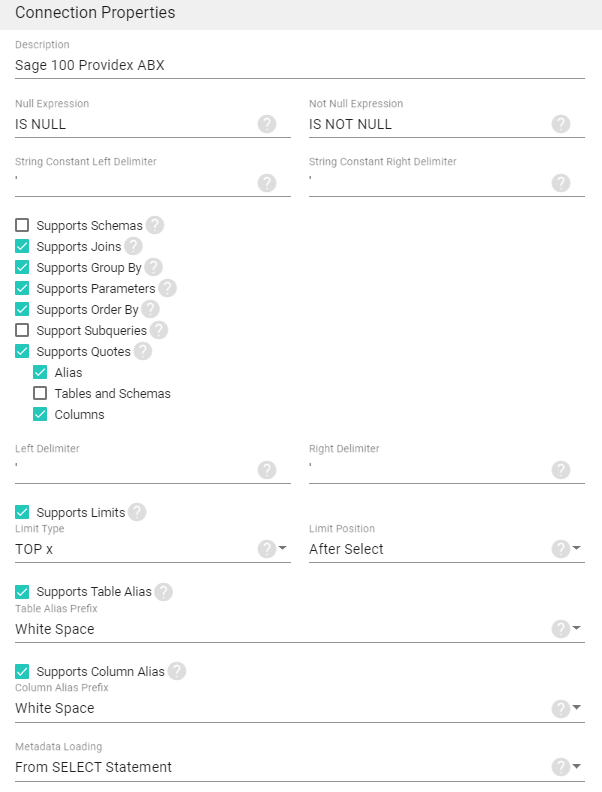 - When ticking the Supports Quotes checkbox, tick only the Alias and Columns checkboxes.