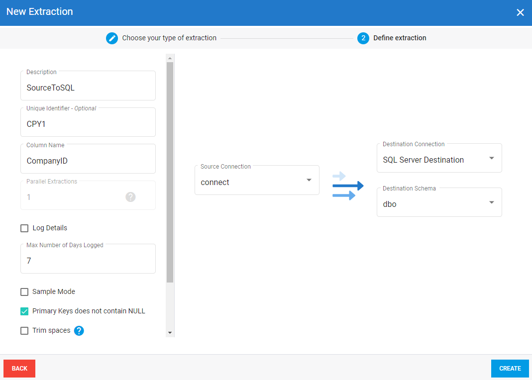 Lorsque que vous créez une extraction, ce panneau s'affiche pour vous permettre de spécifier les connexions source et destination à utiliser pour effectuer l'extraction.