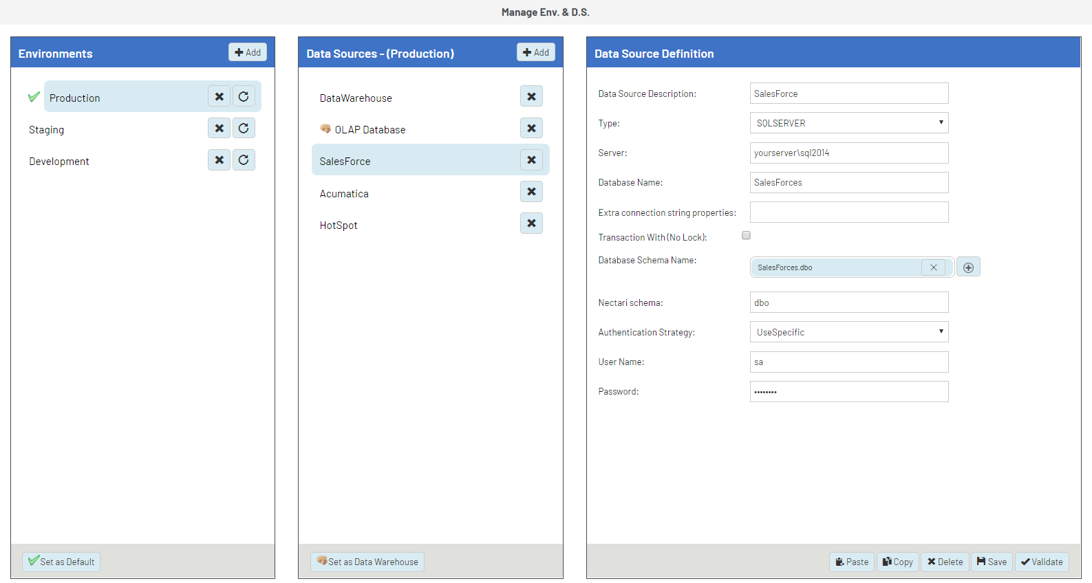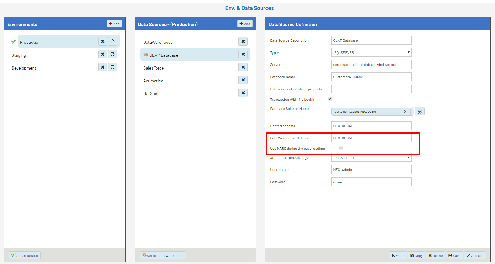 Dans la source de données utilisée pour le cube OLAP (pointant vers la base de données NectariCube), deux nouveaux champs apparaissent après avoir cliqué sur Définir comme entrepôt de données (voir ci-dessous). Env. & Sources de données - Entrepôt de données