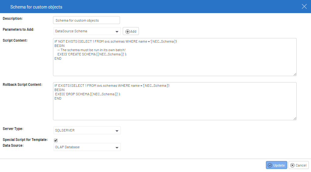 | Source des données | Sélectionnez la source de données dans la liste déroulante. Exécutez toujours un script contre une source de données (configuration au niveau du modèle de données). |