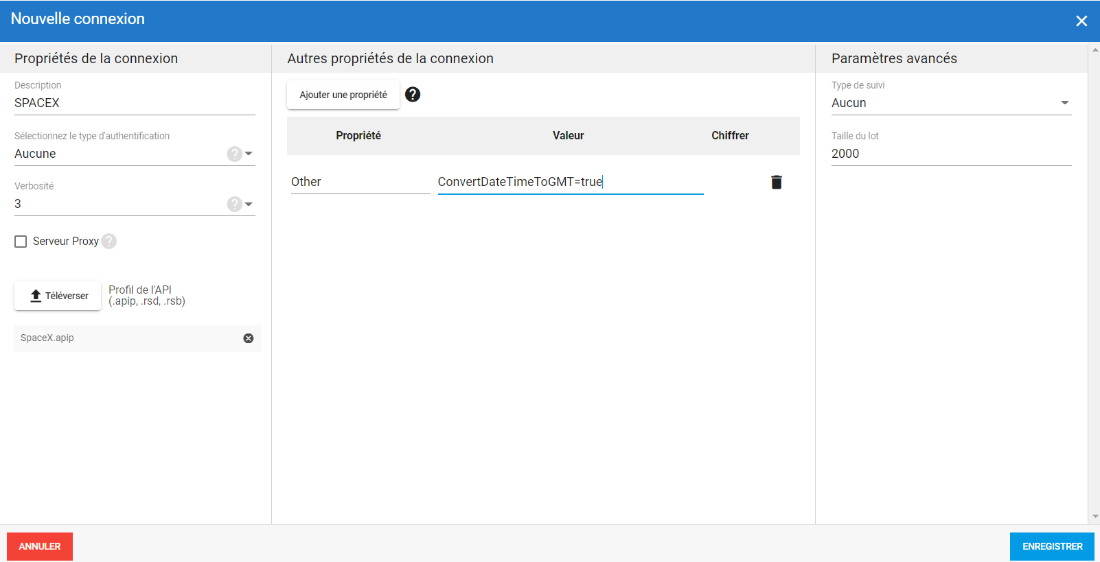 Pour définir une API, il vous suffit de téléverser le fichier du profil API (extension .apip) et/ou les tables (fichiers .rsd) et de spécifier les propriétés (chaînes de connexion) en les ajoutant manuellement dans la section Autres propriétés de la connexion.