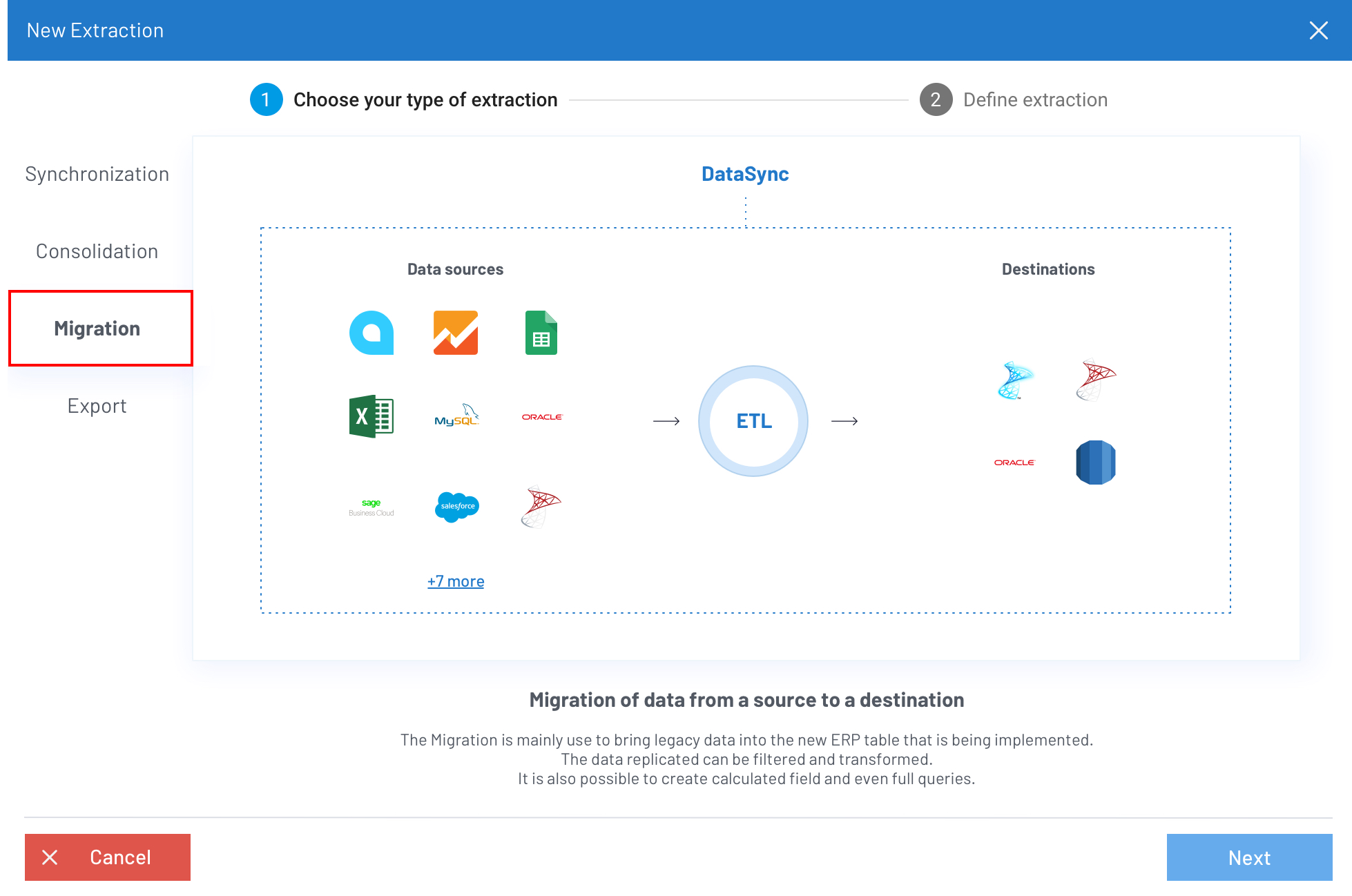 - Exportation : consiste à déplacer des données d'une source vers un fichier Flat (une licence est nécessaire pour accéder à cette fonctionnalité).