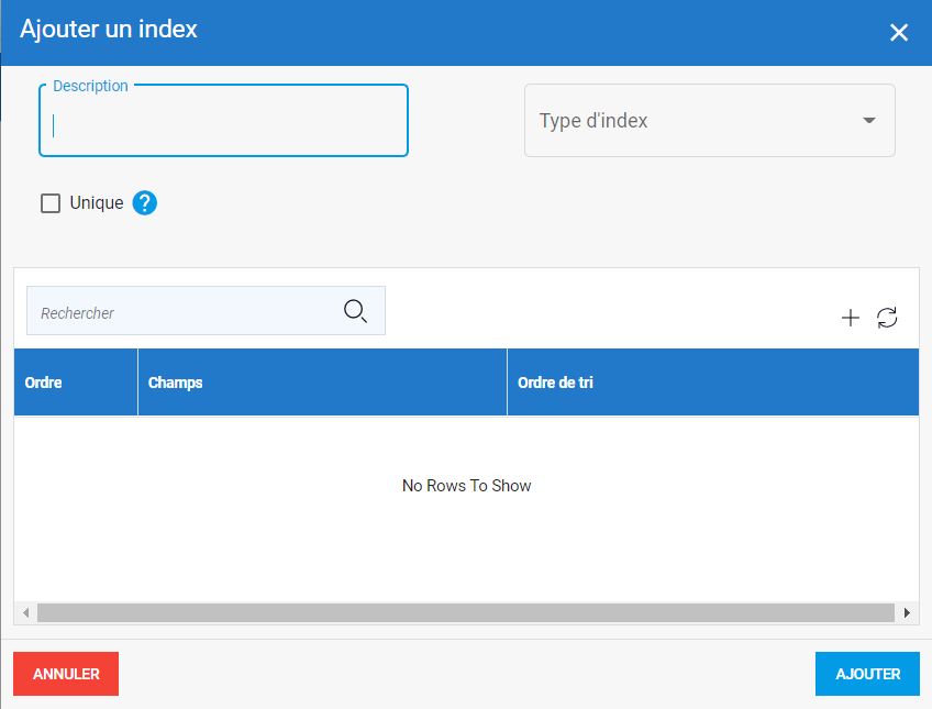 Identifie le nombre de champs créés dans l'index. L'ordre des champs sera l'ordre dans la base de données. Seuls les champs synchronisés peuvent être choisis dans la liste déroulante. Un champ ne peut pas être utilisé deux fois dans un index.