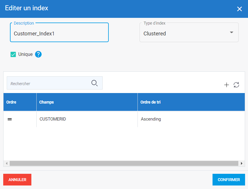 - Configurez l'index tel que décrit dans le tableau ci-dessous.