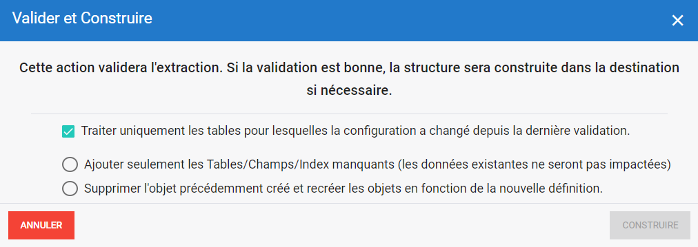 Effectuez l'action de Valider et Construire avec l'option Ajouter seulement les Tables/Champs/Index manquants sélectionnée.