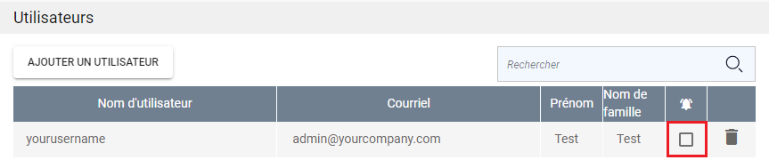 Cocher la case dans la colonne des notifications si l'utilisateur souhaite recevoir des notifications d'alerte par courriel chaque fois qu'une tâche DataSync programmée échoue. Les notifications par courriel sont désactivées par défaut pour tous les utilisateurs.