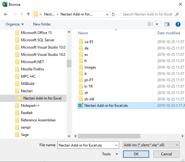 4. Trouvez le fichier Nectari Add-in for Excel.xla dans C:\Program Files\Nectari\Nectari Add-in for Excel et cliquez deux fois sur OK.