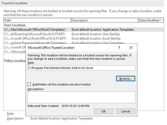 8. Entrez le chemin d'installation C:\Program Files\Nectari\Nectari Add-in for Excel et cliquez sur OK 3 fois pour terminer la procédure d'installation.