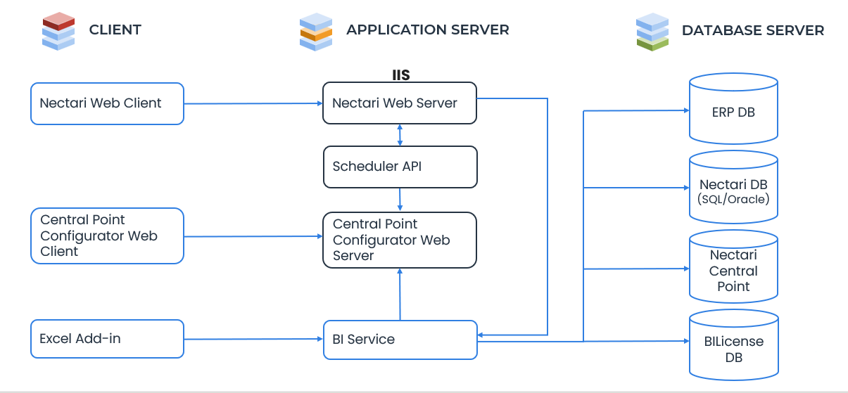 L'application Nectari est l'application principale d'intelligence d'affaires. Cette application est responsable de traiter les requêtes venant des navigateurs web et des applications clientes. Certains modules de l'application Nectari sont déployés et hébergés sur Microsoft IIS et d'autres modules sont hébergés comme services Windows. L'application peut être installé sur un ou plusieurs serveurs selon le scénario choisi. Reportez-vous à Scénarios d'installation pour déterminer quel type d'installation type s'applique à vous.
