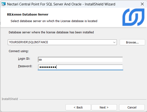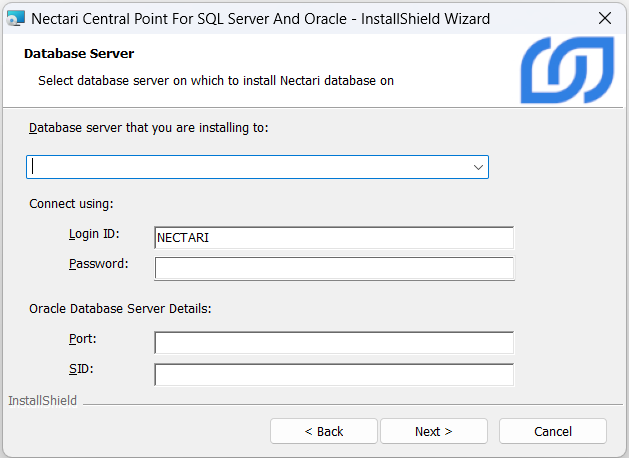 Dans la fenêtre Database Server, indiquez le serveur où la base de données de Nectari sera installée et fournissez les informations d'identification requises pour vous connecter à ce serveur puis cliquez sur Next.