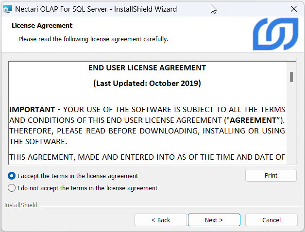 1. Exécutez l'application Nectari OLAP for SQL Server.exe et cliquez sur Next.