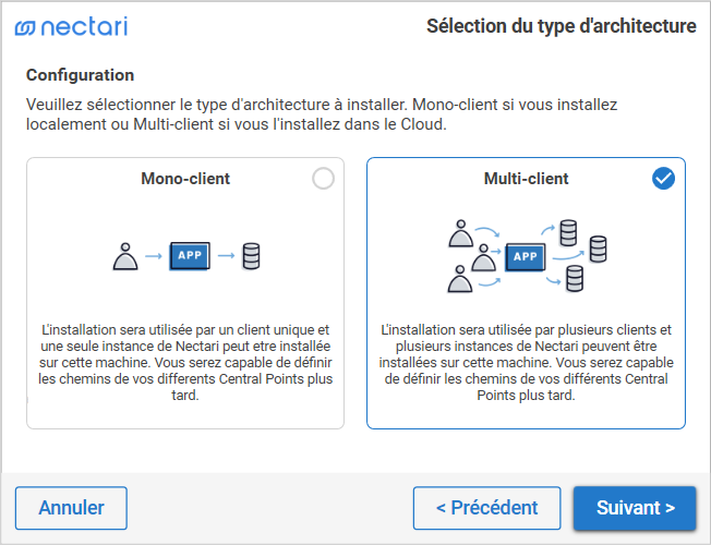 Sélectionnez Mono-client si une seule instance de Nectari sera installée dans l'écosystème.