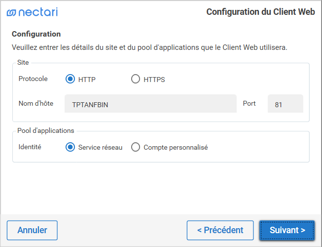 Si vous avez sélectionné le composant Application et/ou le OLAP Worker et/ou le Distribution Worker, l'écran Configuration du Client Web s'affiche :