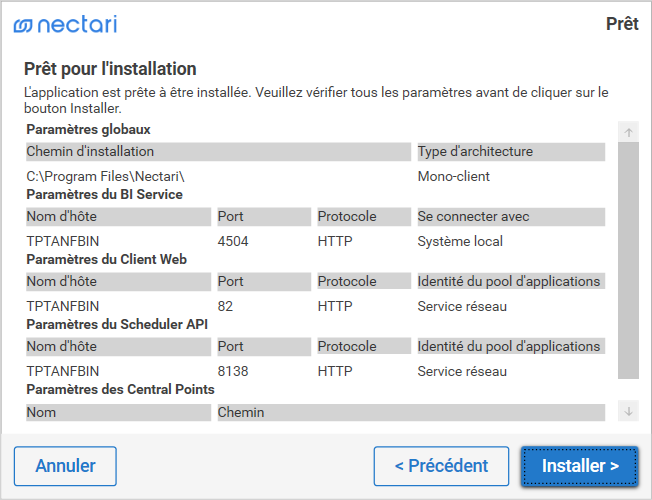 Si vous avez sélectionné l'installation Mono-client, l'écran Configuration des Central Points s'affiche :