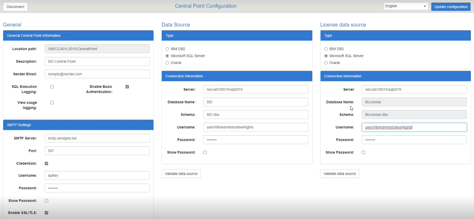 2. Dans les sections Source de données et Source de données de la licence, remplissez les champs Nom d'utilisateur et Mot de passe avec les identifiants de l'utilisateur administrateur.