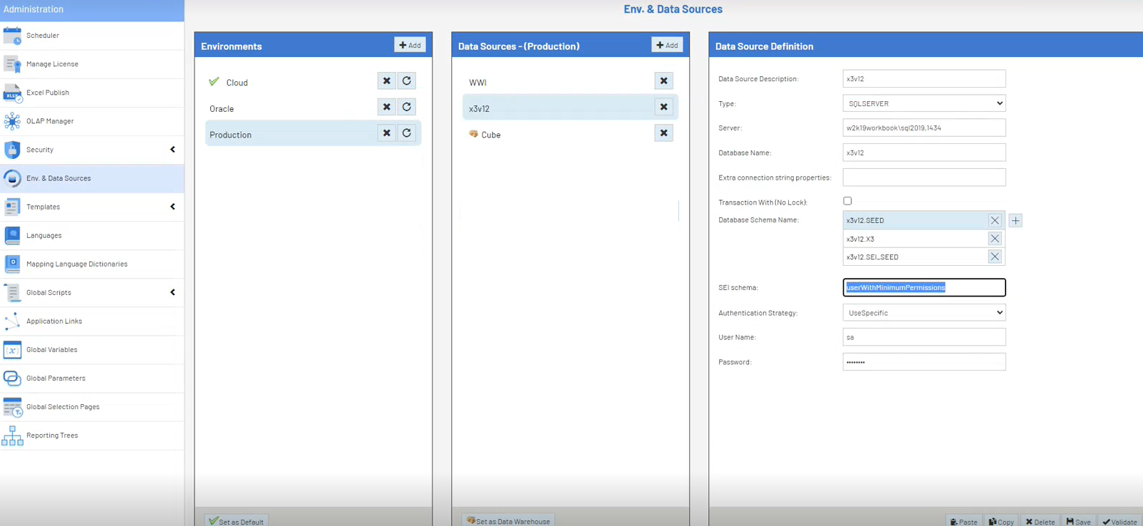 • Les sources de données seront le Cube et votre ERP (X3 dans notre exemple) pour chaque environnement.