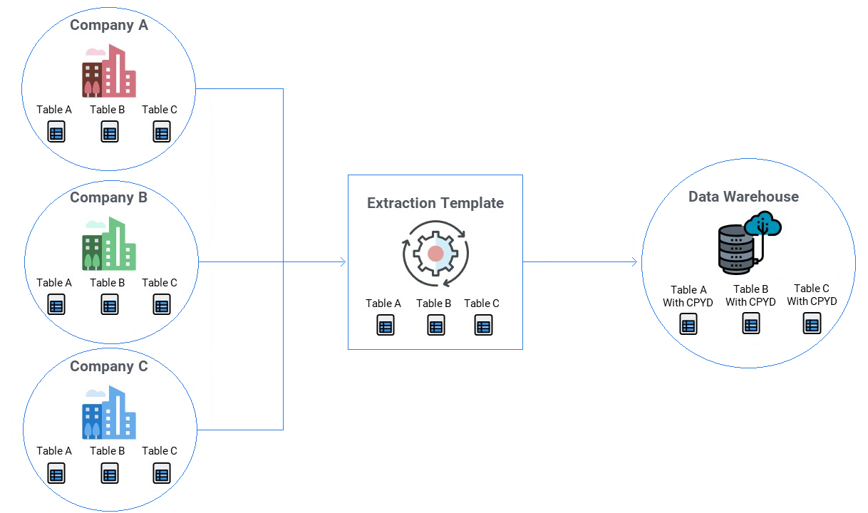 Pour une consolidation, vous devez créer une extraction par base de données (compagnie).