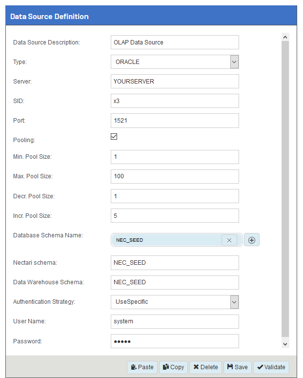 Schéma d'entrepôt de base de données Après avoir sauvegardé la source de données et l'avoir définie comme entrepôt de données, saisissez le schéma Nectaripersonnalisé choisi pour l'environnement actuel.
