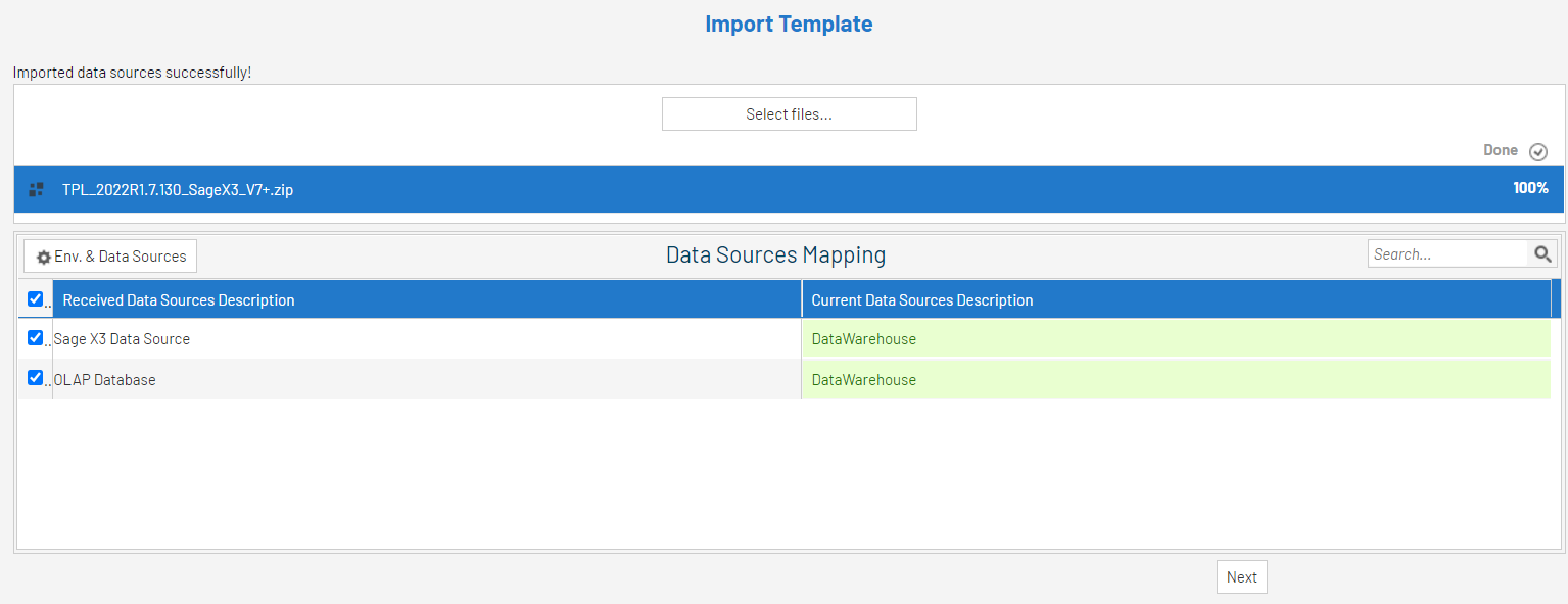 1. Dans la colonne Description des sources de données reçues, assurez-vous que seules les cases Sources de données que vous souhaitez utiliser à partir du modèle sont cochées.