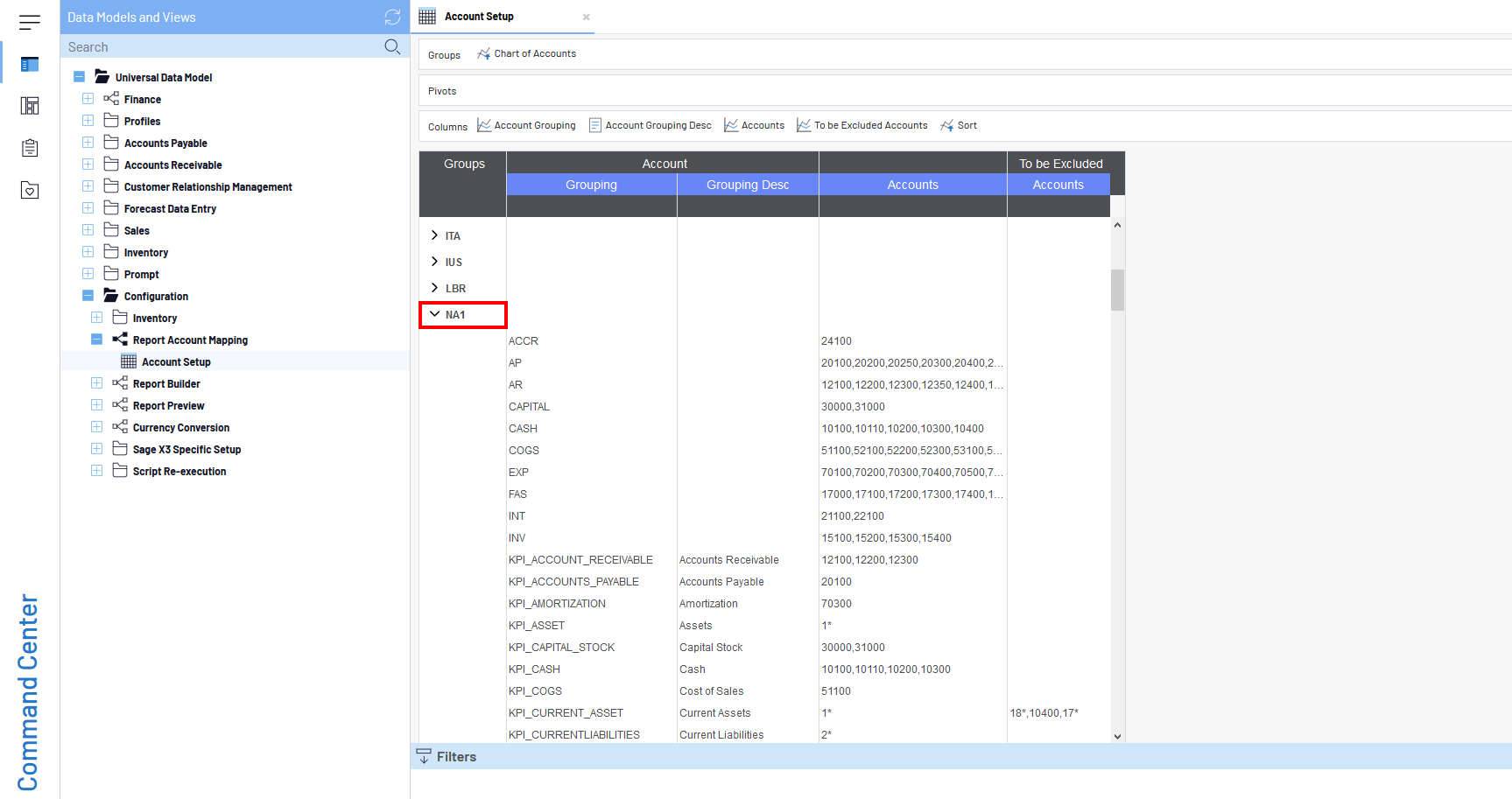6. Développez le modèle de données Regroupement de comptes pour rapport pour ouvrir la vue Configuration des comptes.