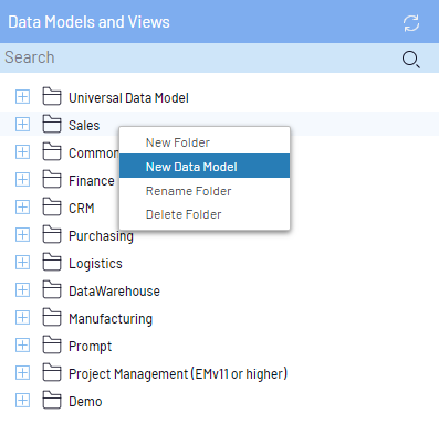 Dans l'onglet Modèles de données et vues, cliquez droit sur n'importe quel dossier (y compris le dossier racine) et sélectionnez Nouveau modèle de données.