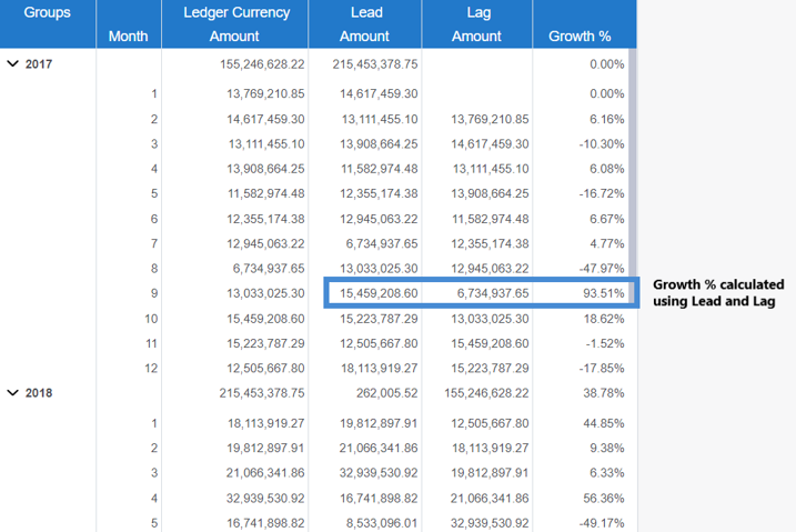 Nous pouvons utiliser les fonctions LAG et LEAD pour calculer de nombreux indicateurs clés de performance qui pourraient être utiles dans une analyse plus approfondie. Avec les retards et les avancements sur la même ligne, il devient plus facile d'effectuer des calculs tels que le pourcentage de croissance des ventes entre deux mois. Dans l'exemple ci-dessous, nous calculons le pourcentage de croissance du montant des ventes pour le mois 9, c'est à dire 93,51 %.