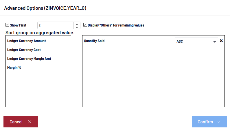 Afficher "Autres" pour les valeurs restantes Les graphiques ont la possibilité de masquer la valeur Autres en décochant cette case. Trier le groupe sur une valeur agrégée Indique l'ordre de tri des enregistrements en fonction des valeurs agrégées sélectionnées.
