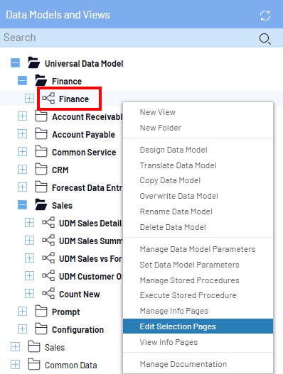 Dans l'onglet Modèles de données et vues, cliquez droit sur le modèle de données et sélectionnez Modifier les pages de sélection.