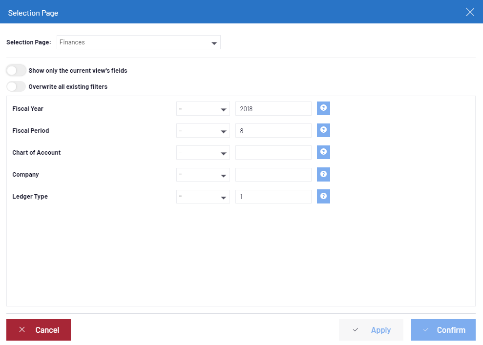 La fenêtre Page de sélection permet aux utilisateurs d'appliquer des filtres à leurs données. Tous les filtres entrés seront combinés avec l'opérateur ET dans le filtre de résultats. Ils seront ajoutés aux filtres existants, sauf si l'option Écraser tous les filtres existants est cochée, auquel cas seuls les filtres verrouillés seront conservés.