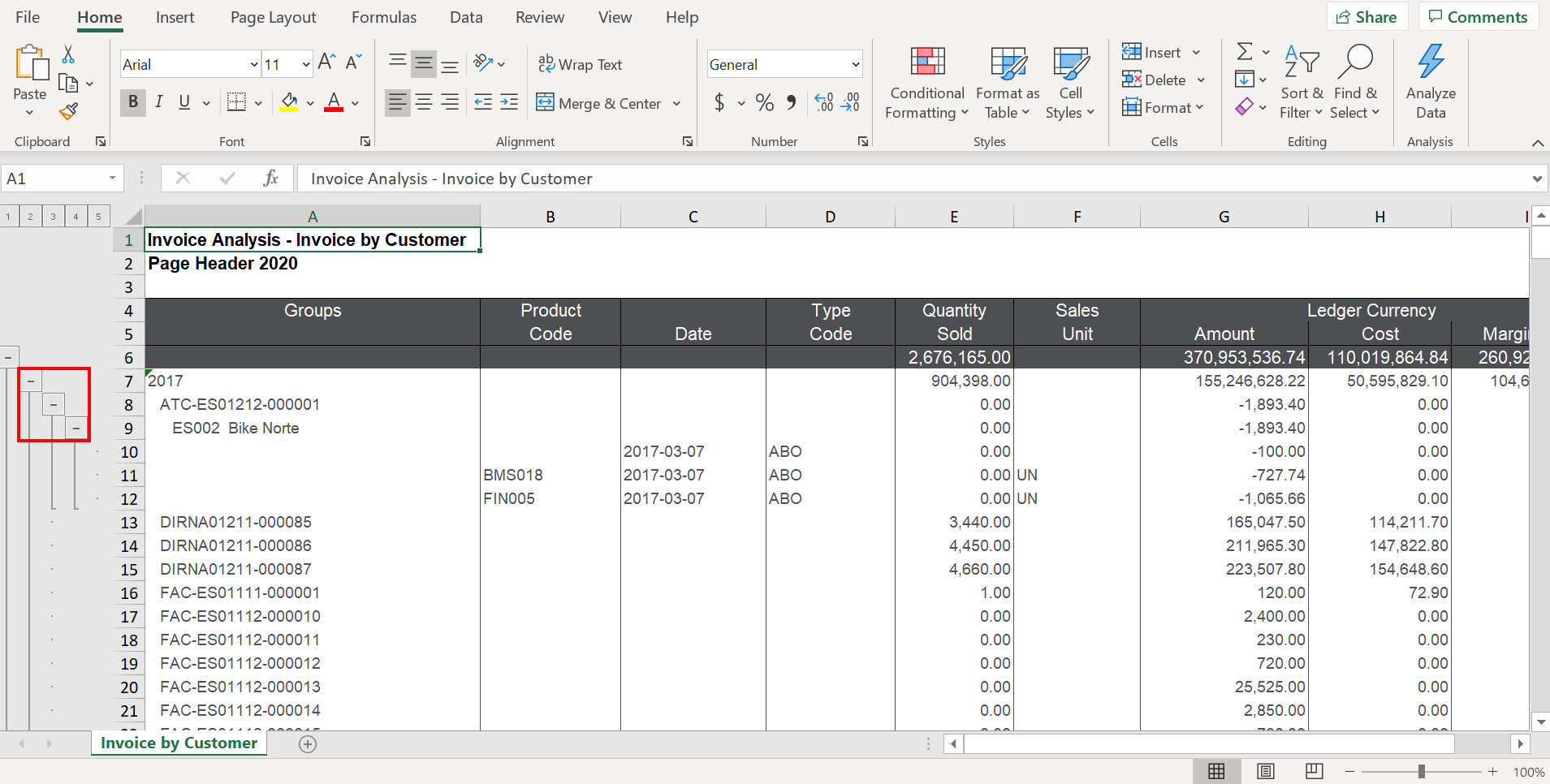 Vous devez développer les niveaux de groupe dans Nectari pour qu'ils s'affichent ainsi dans les exports Excel. L'expansion des niveaux de groupe vous permet de mieux contrôler le niveau de détail qui est affiché.