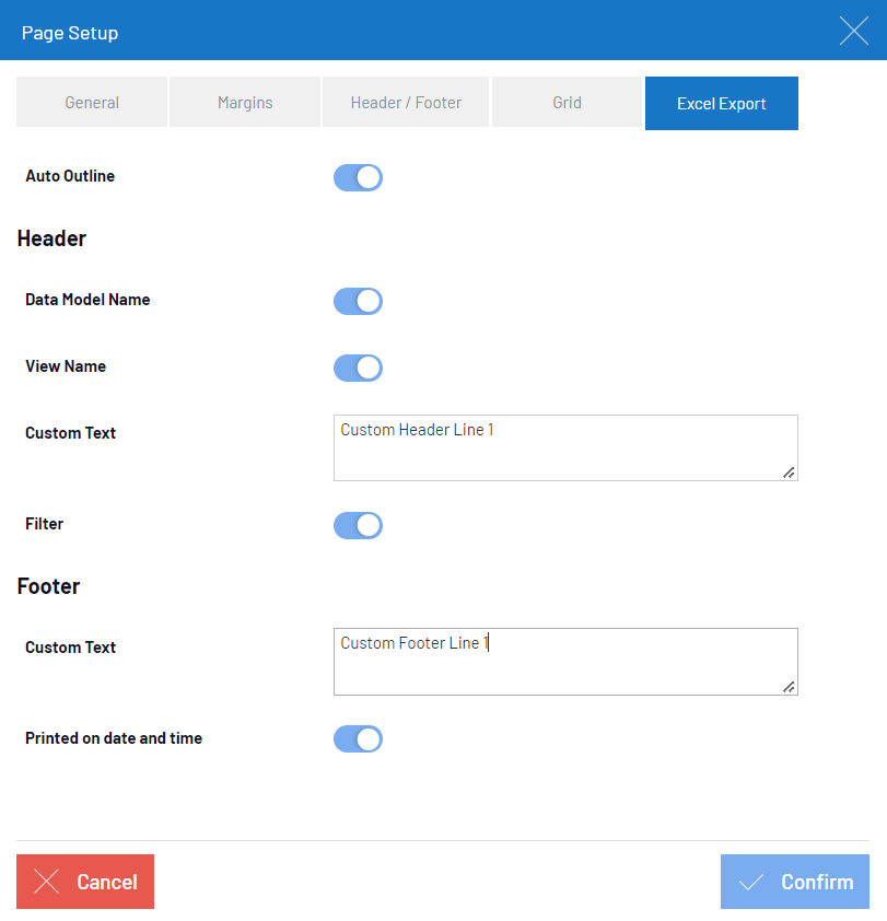 L'onglet Excel Export permet aux utilisateurs de personnaliser les entêtes et les pieds de page qui sont ajoutés dans la grille des vues, des tableaux de bord et des rapports exportés dans un fichier Excel.