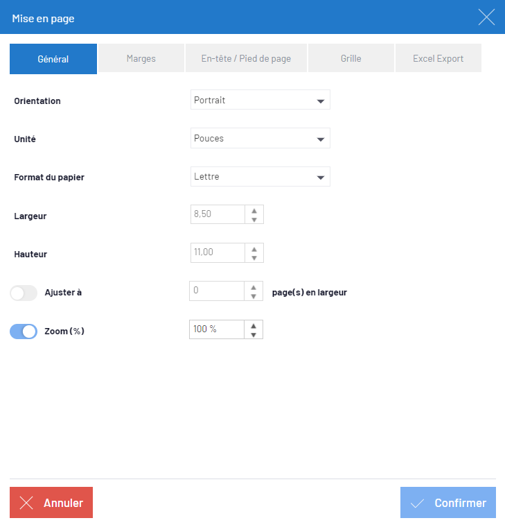 Cliquez sur le ou les onglets appropriés pour faire la mise en page : Général, Marges, En-tête / Pied de page, Grille, Rapport, Excel Export.