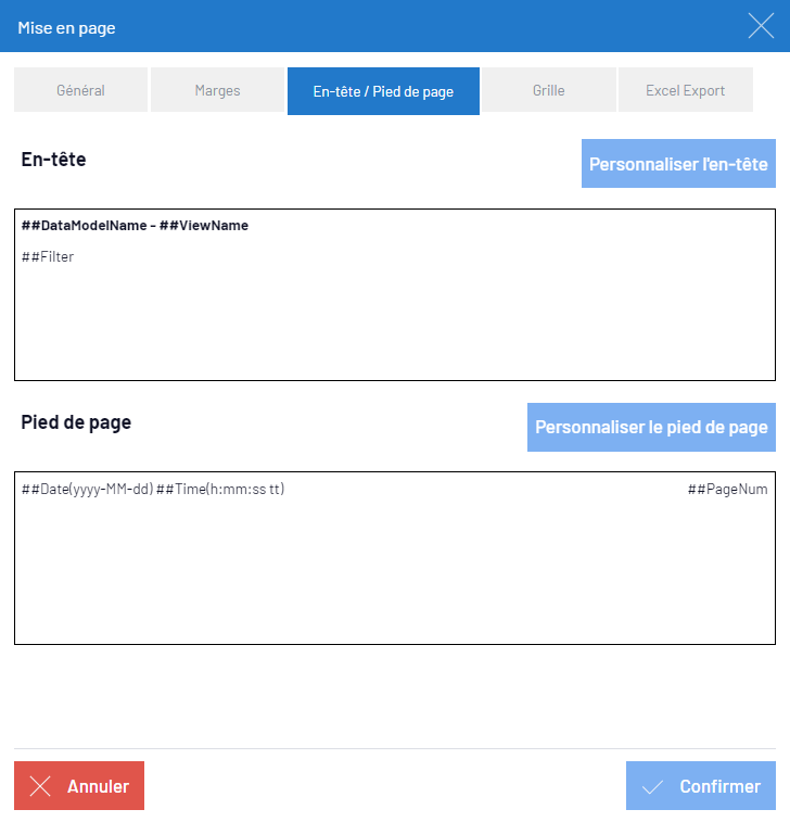 | Personnaliser le pied de page | Permet aux utilisateurs de personnaliser le pied de page de leur export. En cliquant sur le bouton Personnaliser le pied de page, la fenêtre contextuelle Personnalisation du pied de page s'affiche. |