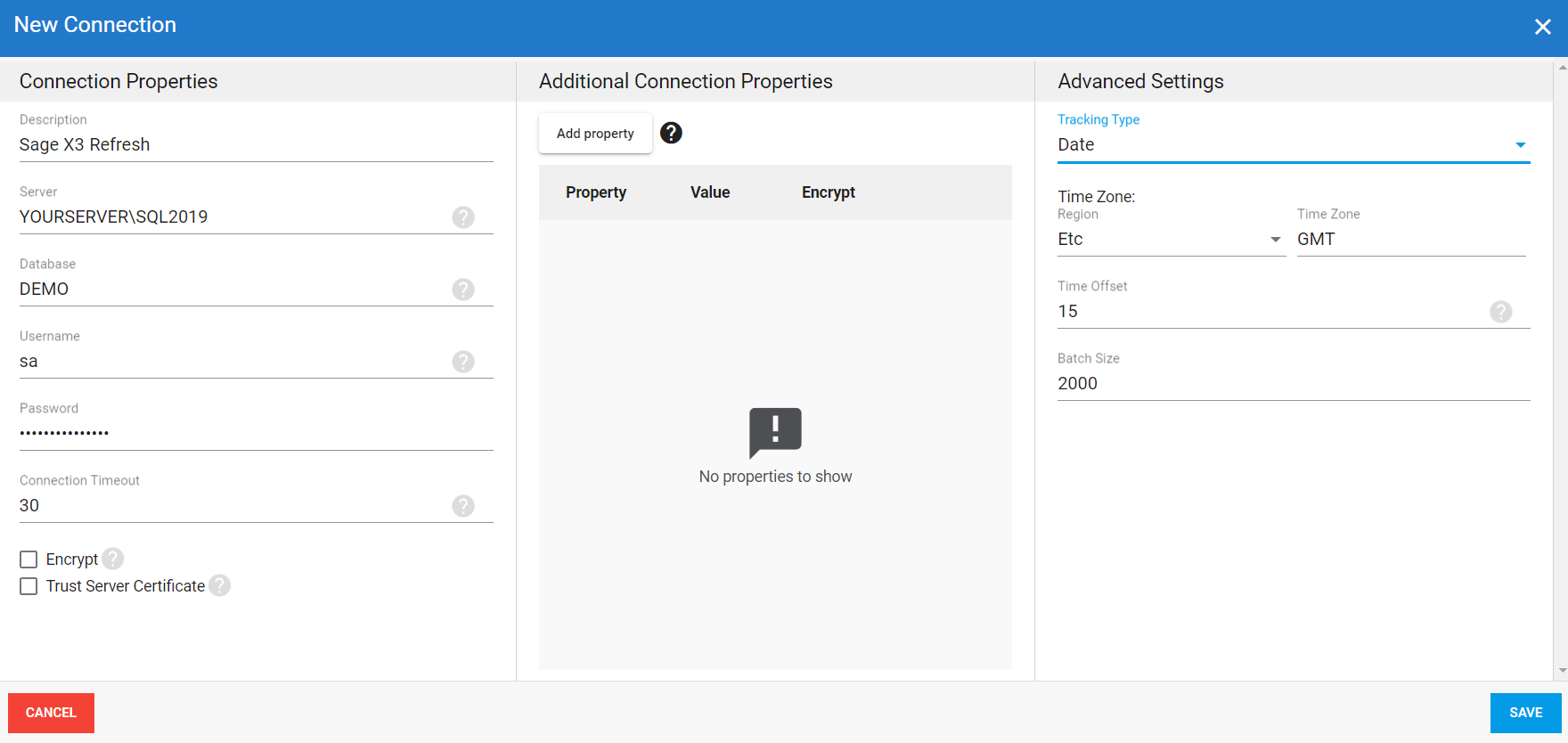 You need to create a destination connection for the Sage X3 Data Warehouse. This connection will receive data from the Refresh source connection.