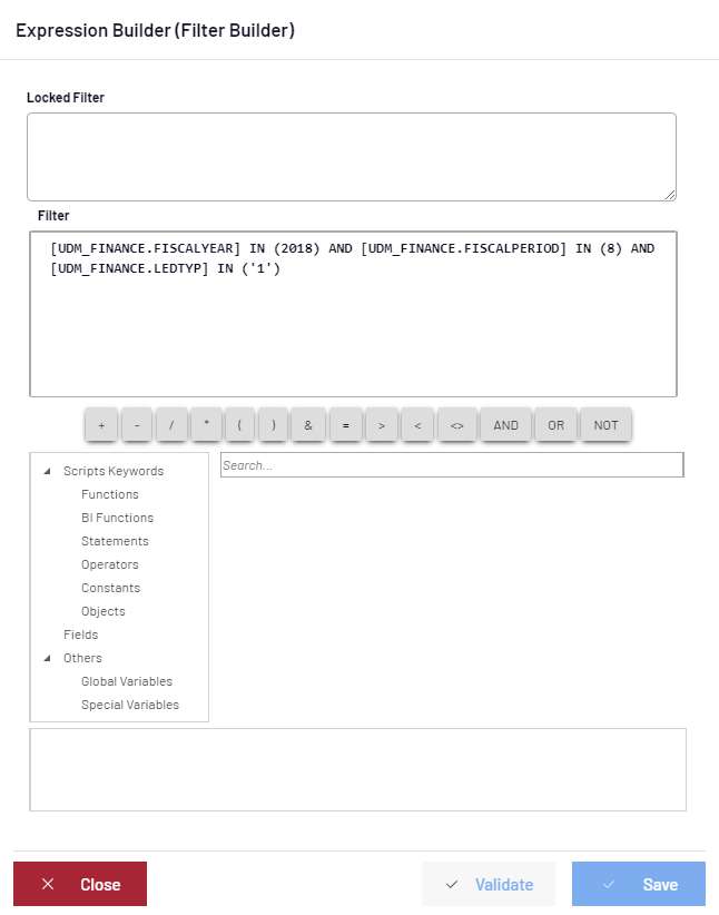 The Expression Builder is a user-friendly tool used to manually edit your filter using SQL. Various fields, functions and operators are available to build the expression.