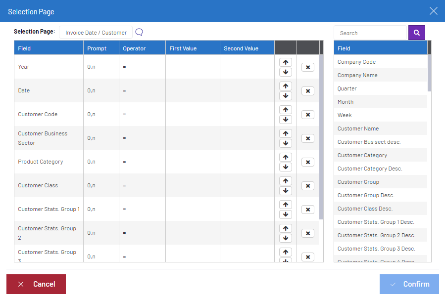 • The left section of the window lists the fields contained in the Selection Page.